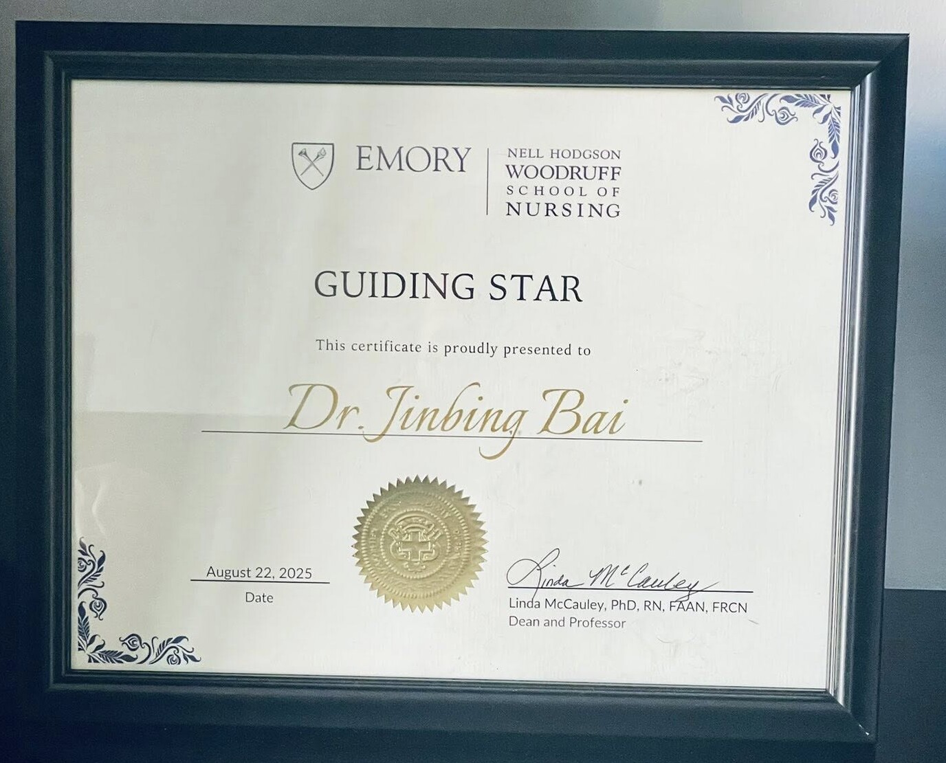 Dr. Bai was awarded the Guiding STAR Mentorship Award from Nell Hodgson Woodruff School of Nursing at Emory University. This award shows the tremendous dedications of Dr. Bai on mentoring of nursing and non-nursing students and scholars.
